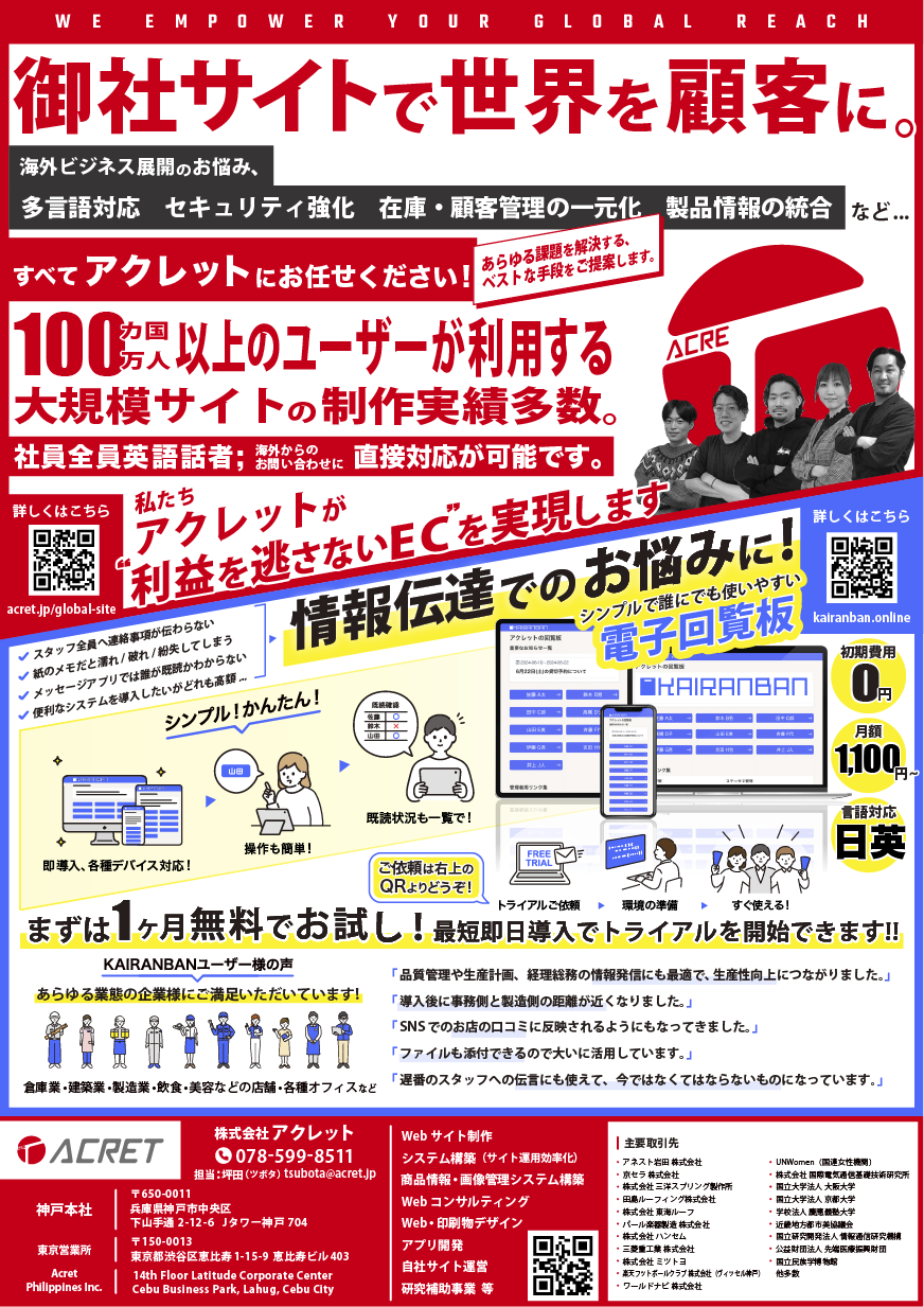 多言語対応のウェブサイト制作から効率的なコミュニケーションプラットフォームまで、お客様の国際ビジネスに合わせたソリューションを提供いたします。当社の制作実績ページにて、お客様のような企業様がオンラインで成功された実例をぜひご覧ください。