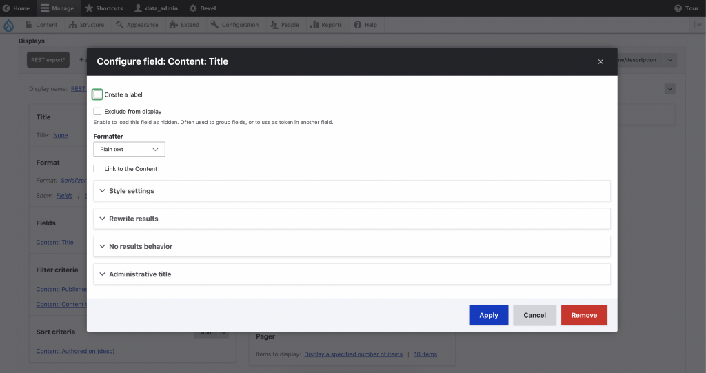 6. The default fields to be shown after selecting “Fields” is “Title”. For this example we’ll remove the link to node in the title by unchecking the “Link to the Content” checkbox then hit “Apply”.