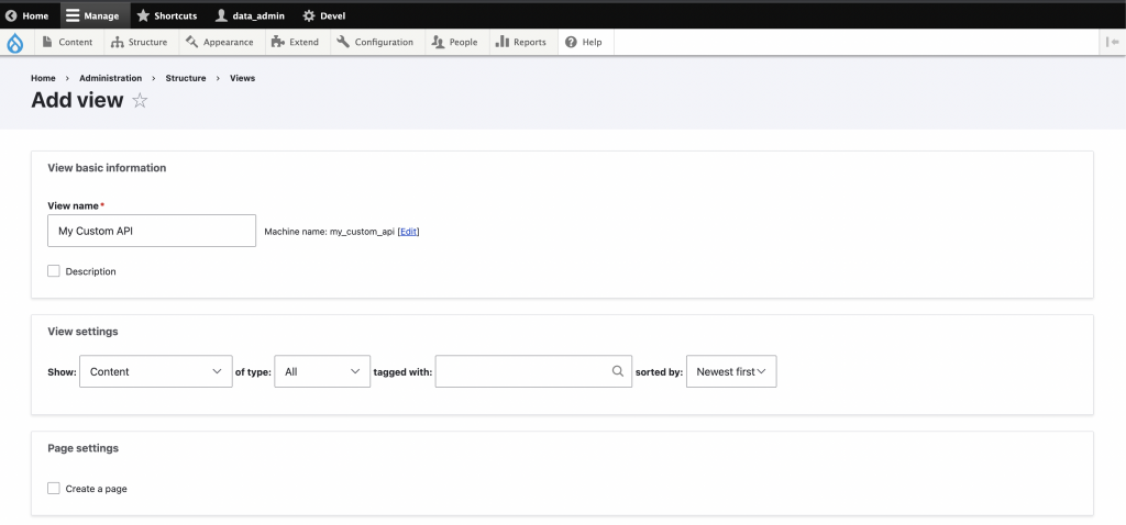 2. We’ll go to Views (/admin/structure/views), and create a new view configuration namely “My Custom API” and choose the type of contents/taxonomy you want to render.