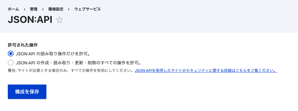 記事の作成や更新、削除といった操作をAPI経由で行いたい場合は、/admin/config/services/jsonapi にある設定画面で「CRUD操作を許可」をオンにする必要があります。