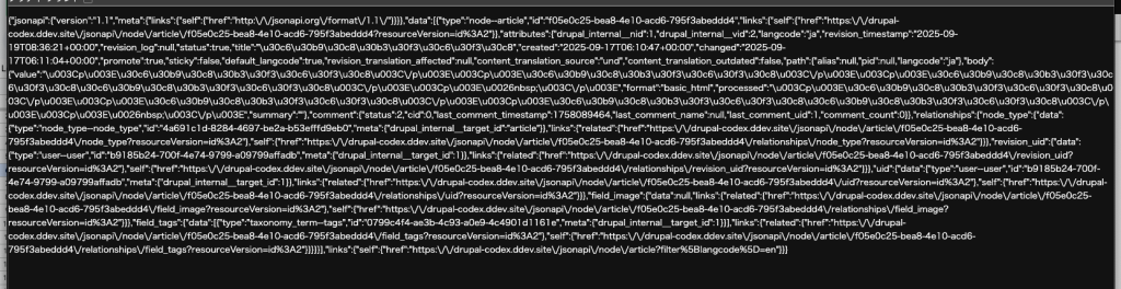 ※以下は"/jsonapi/node/article?filter[langcode]=en "にアクセスし英語の記事コンテンツのみ表示